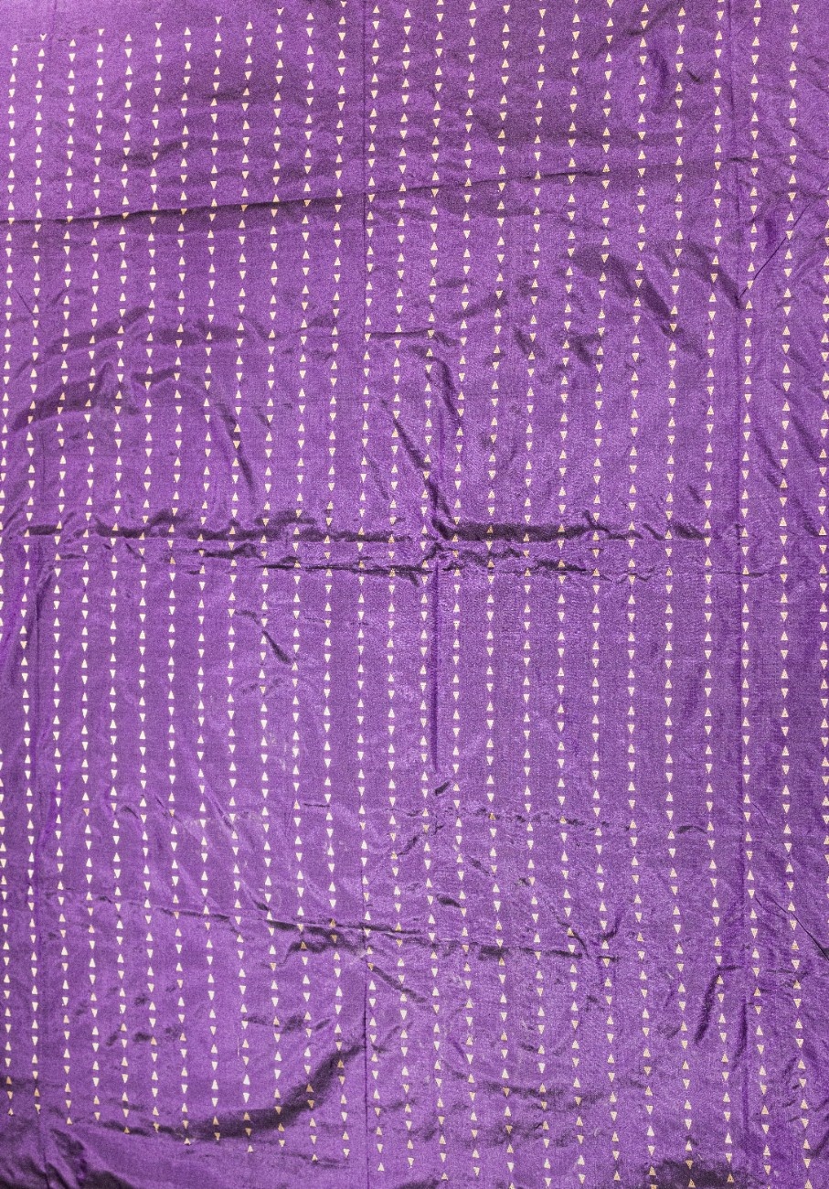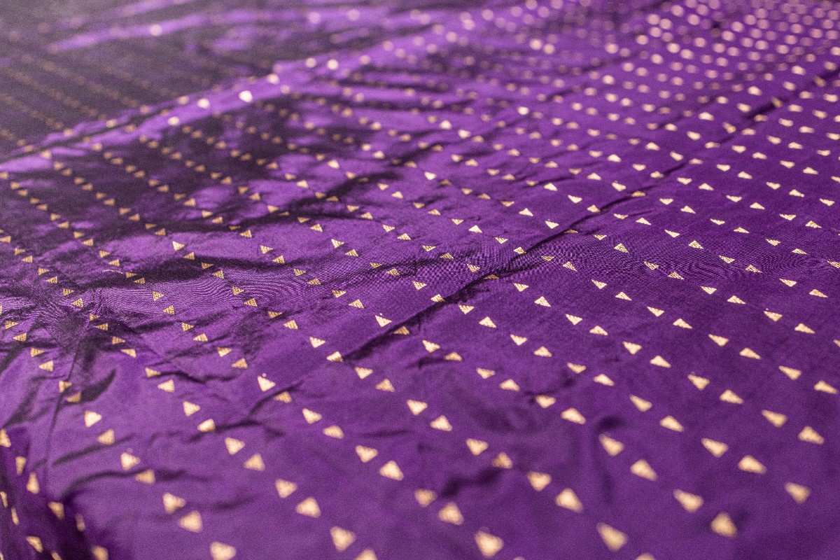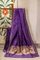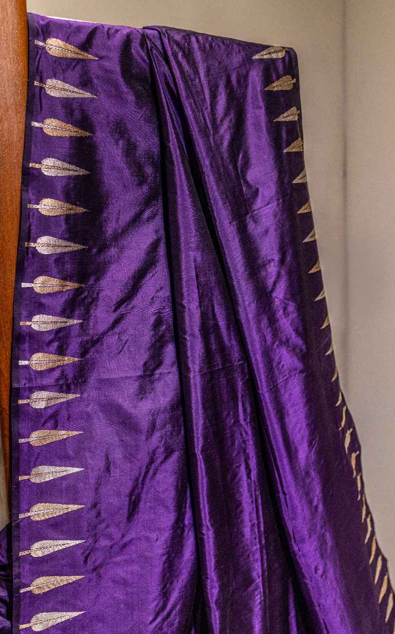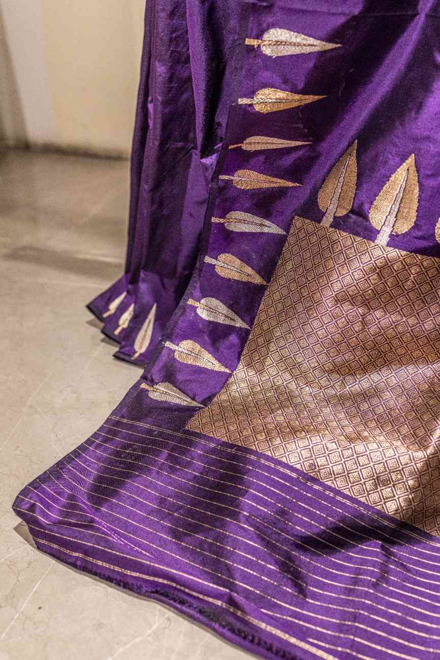 Features a rich, solid purple body adorned with elegant golden zari leaf motifs along the borders